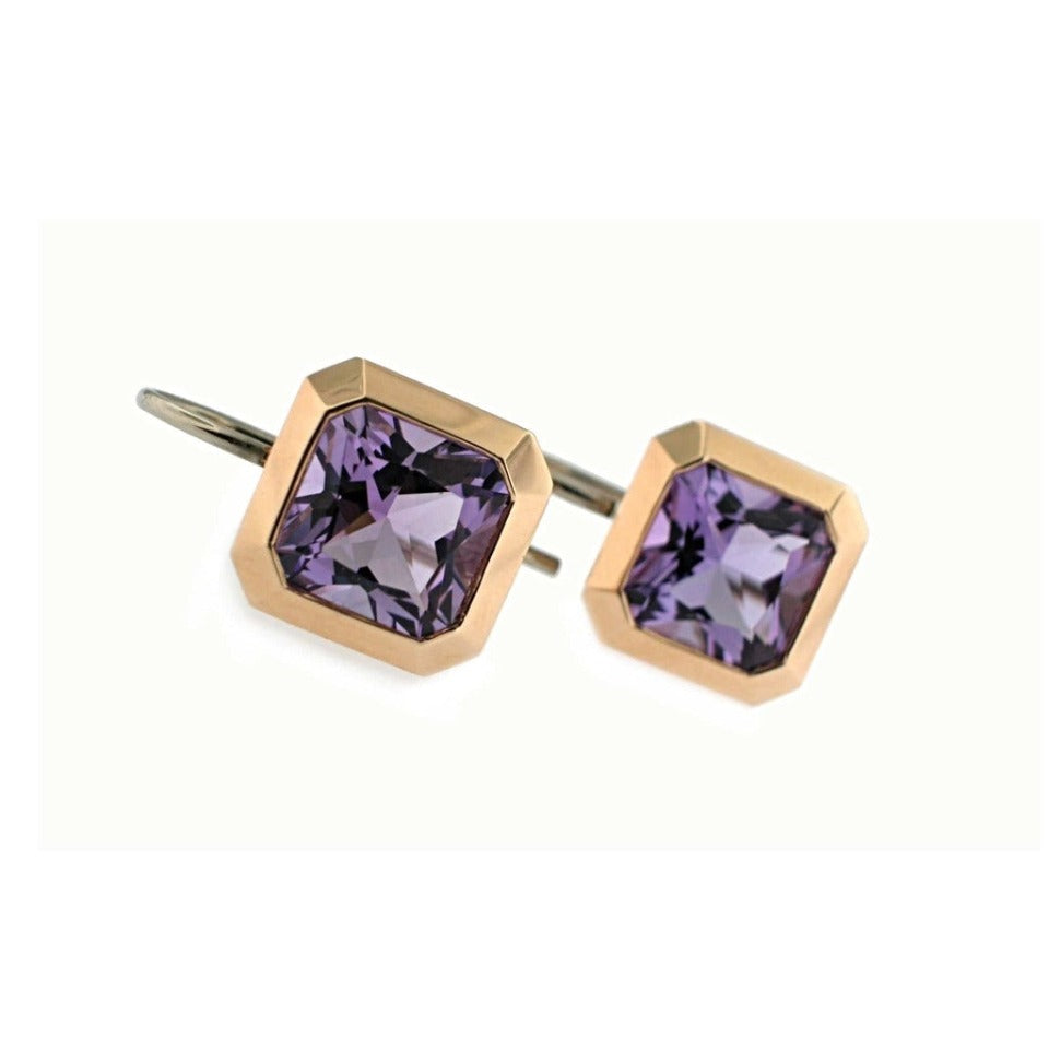 Lavender amethysts are set into 14k rose gold bezels to create these modern earrings. The 8 mm x 8 mm stones are radiant cut and weigh approximately 4 carats total weight. Gallery opening along all 4 sides of the earrings makes them lightweight and comfortable to wear all day long. The 14k white gold handmade ear wires are 20 mm long and hook closed. They are also available in blue topaz and rock crystal.